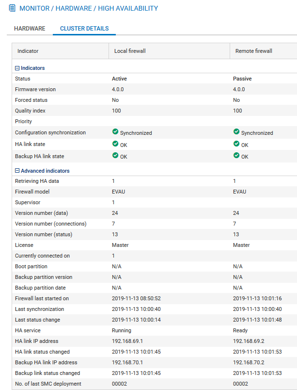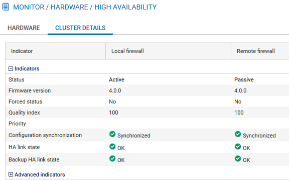 - By clicking on Advanced indicators, you can show other information such as the date of the last synchronization, the last status change of one or both HA links: