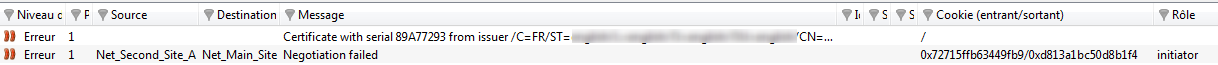 - The messages “Negotiation failed” and “Certificate with serial XXX from issuer YYY: unable to get local issuer certificate” in phase 1 appear in the module Logs > VPN in Stormshield Network Real-Time Monitor on the “initiator” Firewall