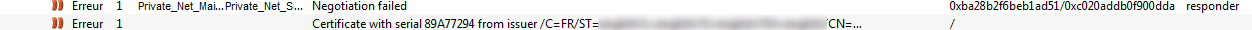 - The messages “Negotiation failed” and “Certificate with serial XXX from issuer YYY: unable to get local issuer certificate” in phase 1 appear in the module Logs > VPN in Stormshield Network Real-Time Monitor on the “responder” Firewall