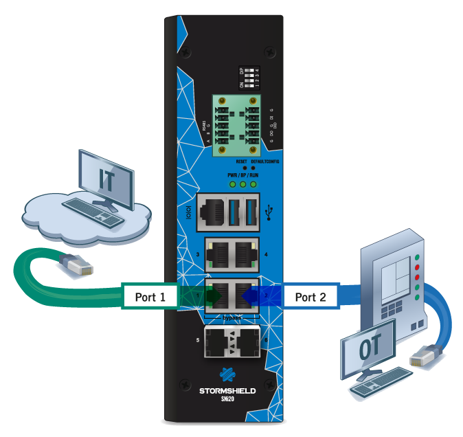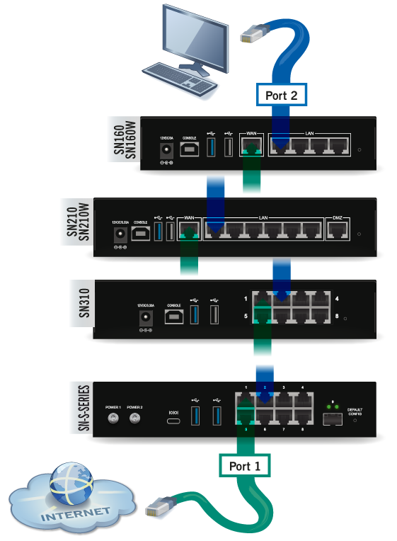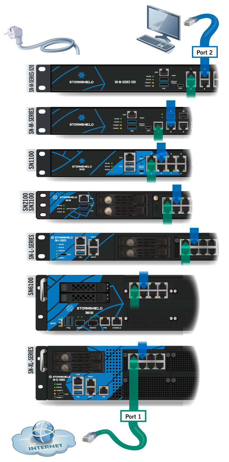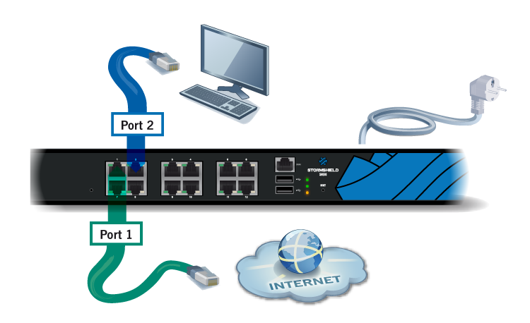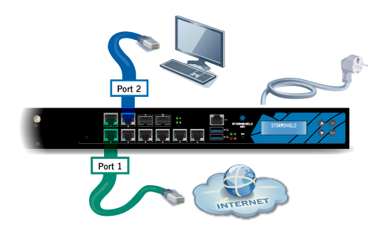 The client workstation can either be linked directly to the firewall’s internal interface or connected to the local network, which is itself connected to the firewall’s internal interface. For a direct connection of the workstation to the firewall, use the crossover Ethernet cable provided with the product. Details on how to connect SNxr1200 model firewalls are given in the section Cabling on the SNxr1200 model below.