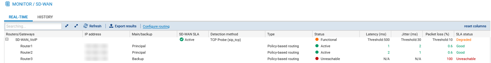 The Real time tab shows information about the SD-WAN SLA on monitored gateways and routers.