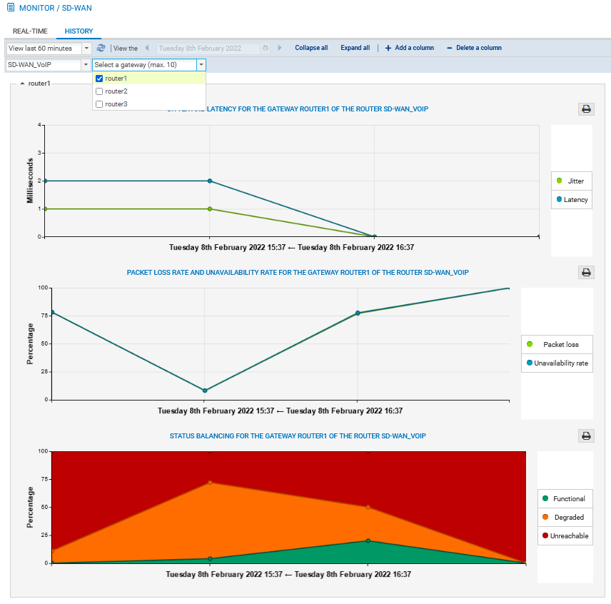 In this tab, up to five gateways can be selected for a given router to display curves that show changes in latency, jitter, packet loss rate, availability and proportion of time each selected gateway spent in the various states.