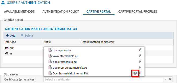 - Go to Configuration > Users > Authentication, Captive portal tab, SSL server section.