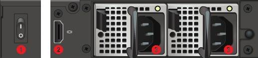1 : Bouton d'alimentation 2 : Port HDMI : branchement de l'écran 3 : Embases secteur pour la redondance d'alimentation |