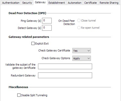La fonction DPD (Dead Peer Detection) permet au Client VPN de détecter que la passerelle VPN devient inaccessible ou inactive. La période de vérification est la période entre deux envois de messages de vérification DPD, exprimée en secondes. La fonction de DPD est active à l’ouverture du tunnel (après la phase d’authentification). Associé à une passerelle redondante, le DPD permet au Client VPN de basculer automatiquement d’une passerelle à l’autre sur indisponibilité de l’une ou l’autre. |