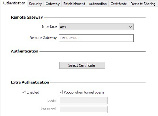 Cette option apporte un niveau de sécurité supplémentaire en demandant à l’utilisateur la saisie d’un login / mot de passe à chaque ouverture du tunnel. Lorsque la case Popup quand le tunnel s’ouvre est cochée, le login et le mot de passe sera demandé à l’utilisateur à chaque ouverture du tunnel. Lorsqu’elle est décochée, le login et le mot de passe doivent être saisis ici de manière permanente. L’utilisateur n’aura alors pas besoin de les saisir à chaque ouverture du tunnel. |