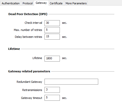 | Durée entre essais | Intervalle entre les messages DPD lorsqu’aucune réponse n’est reçue de la passerelle VPN, exprimé en secondes. |