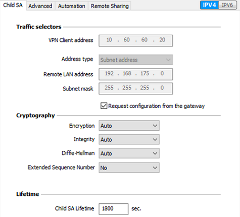 Pour configurer les paramètres d’un Child SA, sélectionnez ce Child SA dans l’arborescence de la configuration VPN. Les paramètres se configurent dans les onglets de la partie droite du Panneau de Configuration.