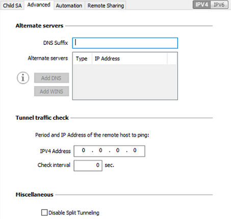 Table des adresses IP des serveurs DNS (2 maximum) et WINS (2 maximum) accessibles sur le réseau distant. Les adresses IP seront des adresses IPv4 ou IPv6 suivant le type de réseau choisi dans l’onglet Child SA. NOTE