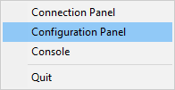 Pour ouvrir le Panneau de Configuration, il faut préalablement avoir lancé le Client VPN en tant qu’administrateur (cf. paragraphe Démarrer le Client VPN en tant qu’administrateur ci-dessus). Si ce n’est pas le cas, quittez et relancer le Client VPN en tant qu’administrateur. Si c’est le cas, cliquez avec le bouton droit de la souris sur l’icône en barre des tâches (cf. paragraphe Icône en barre des tâches ci-dessus), puis sélectionnez l’option Panneau de Configuration. Le Panneau de Configuration est décrit dans le chapitre Panneau de Configuration.