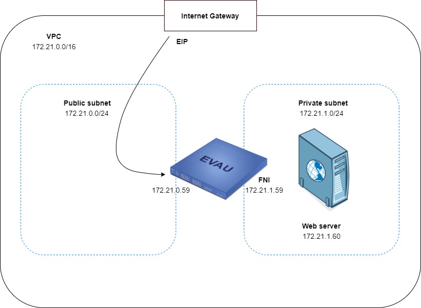 The deployed firewall is equipped with two network interfaces - a public (unprotected) interface and a private (protected) interface.