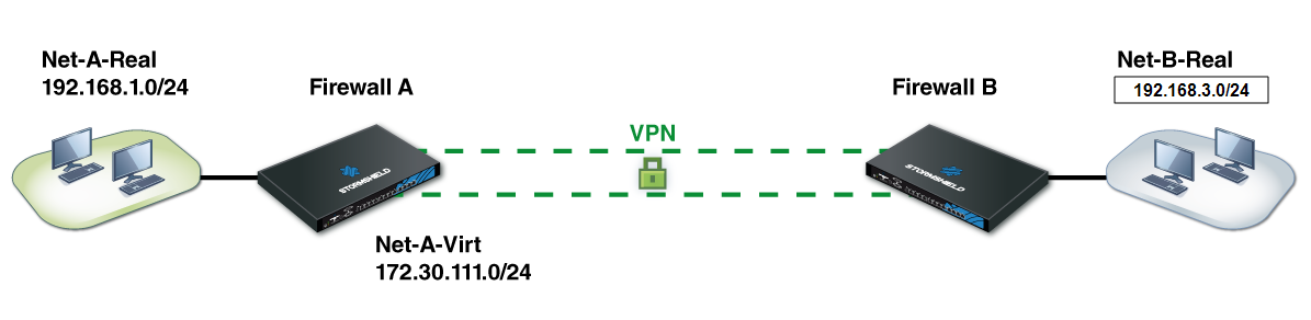 In this example, Net-A-Real located behind Firewall A will appear as Net-A-Virt to site B.