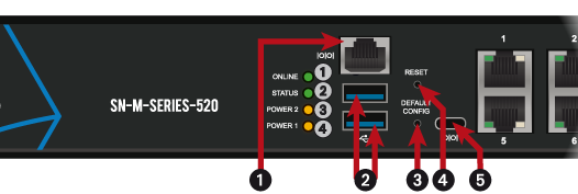 1: Serial port for access in console mode 2: USB 3.0 port 3: Button to reset the appliance to its factory settings (defaultconfig). 4: Reset button 5: USB-C port console access |