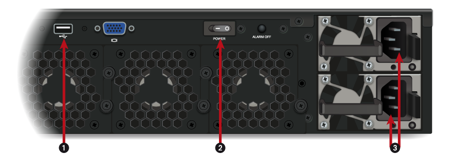 1: USB 2.0 port 2: On/off switches 3: Sockets for mains power supply |