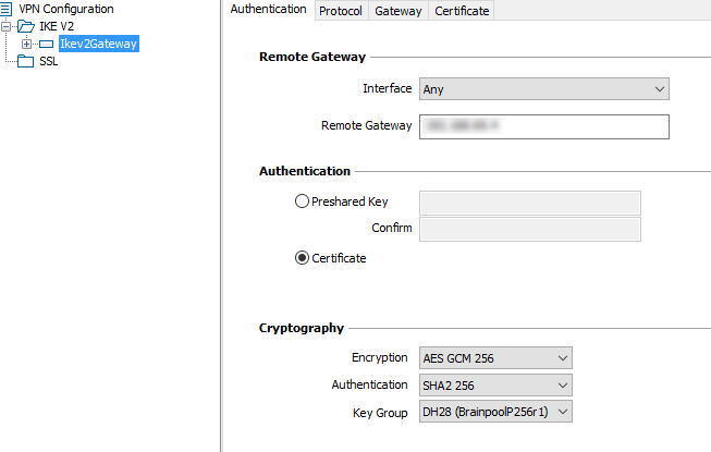- Pour le champ Diffie Hellman, sélectionnez la même valeur que celle paramétrée pour la passerelle précédemment créée : DH28 (BrainpoolP 256r1) ou DH19 (ECP 256).