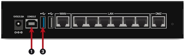 2. Raccordez le port USB (1) à un port USB de l'ordinateur à l'aide du câble USB fourni avec le firewall SNS.