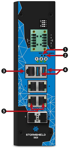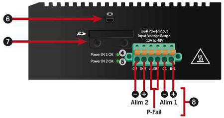 1 : Bouton Reset 2 : Bouton de mise en configuration d'usine (defaultconfig) 3 : Port série en mode console 4 : Ports USB 3.0 5 : Ports réseau Ethernet dédiés au Bypass 6 : Port micro HDMI : branchement de l'écran 7 : Emplacement carte SD 8 : Connecteur à vis six pôles (pour alimentation électrique redondante 48 V DC). |