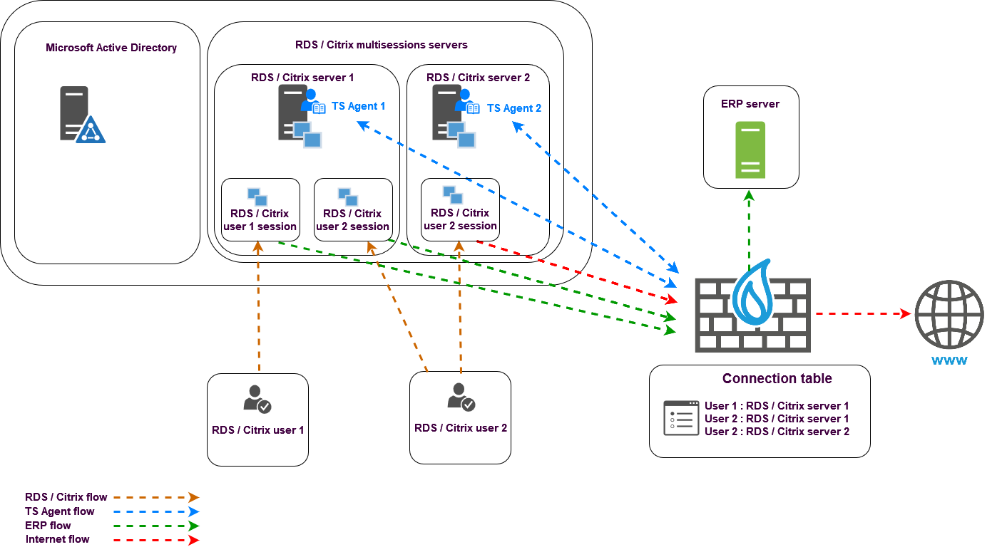 Cette méthode repose sur des échanges entre un service dédié présent sur le firewall SNS (service TSD) et des agents (Agents TS) déployés sur des serveurs Citrix Virtual Apps and Desktops ou Microsoft Remote Desktop Services (RDS).